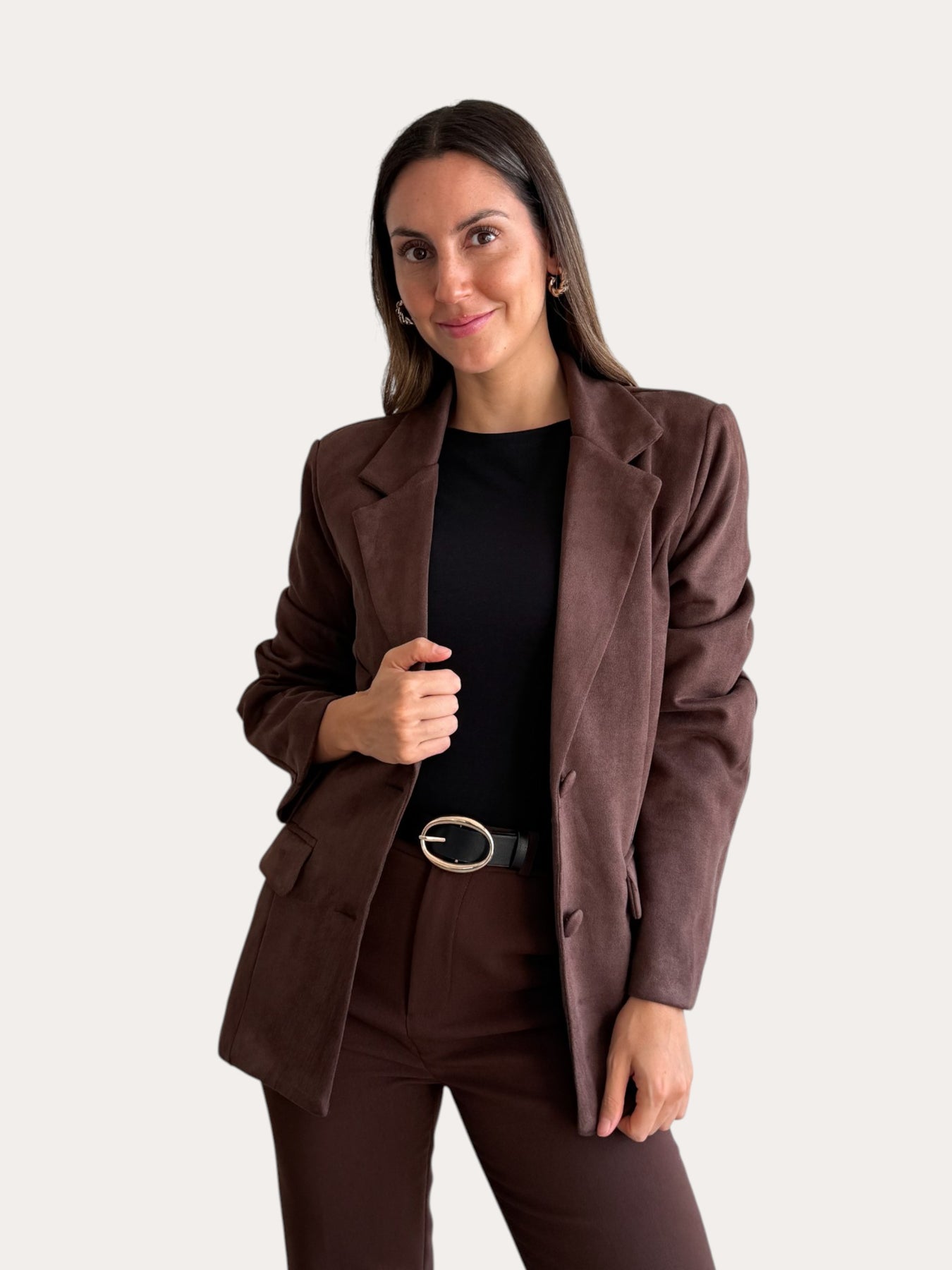Blazer gamuzado de corte estructurado, con solapa clásica y calce semi entallado que define la silueta. Diseño de líneas limpias, con botones frontales y bolsillos funcionales. Confeccionado en textura suave tipo gamuza, ideal para elevar looks formales o casuales con un acabado sofisticado y atemporal.