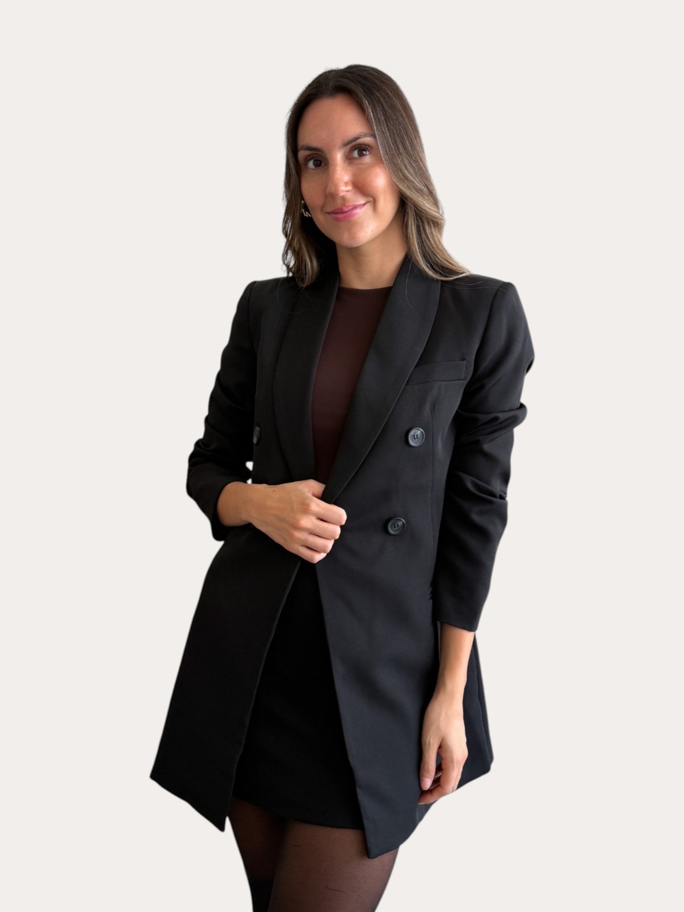Blazer negro de corte estructurado, diseño de doble botonadura con solapas clásicas y acabado limpio, que garantiza un ajuste preciso y favorecedor. Incorpora forro interior para mayor comodidad y mejor caída de la prenda.