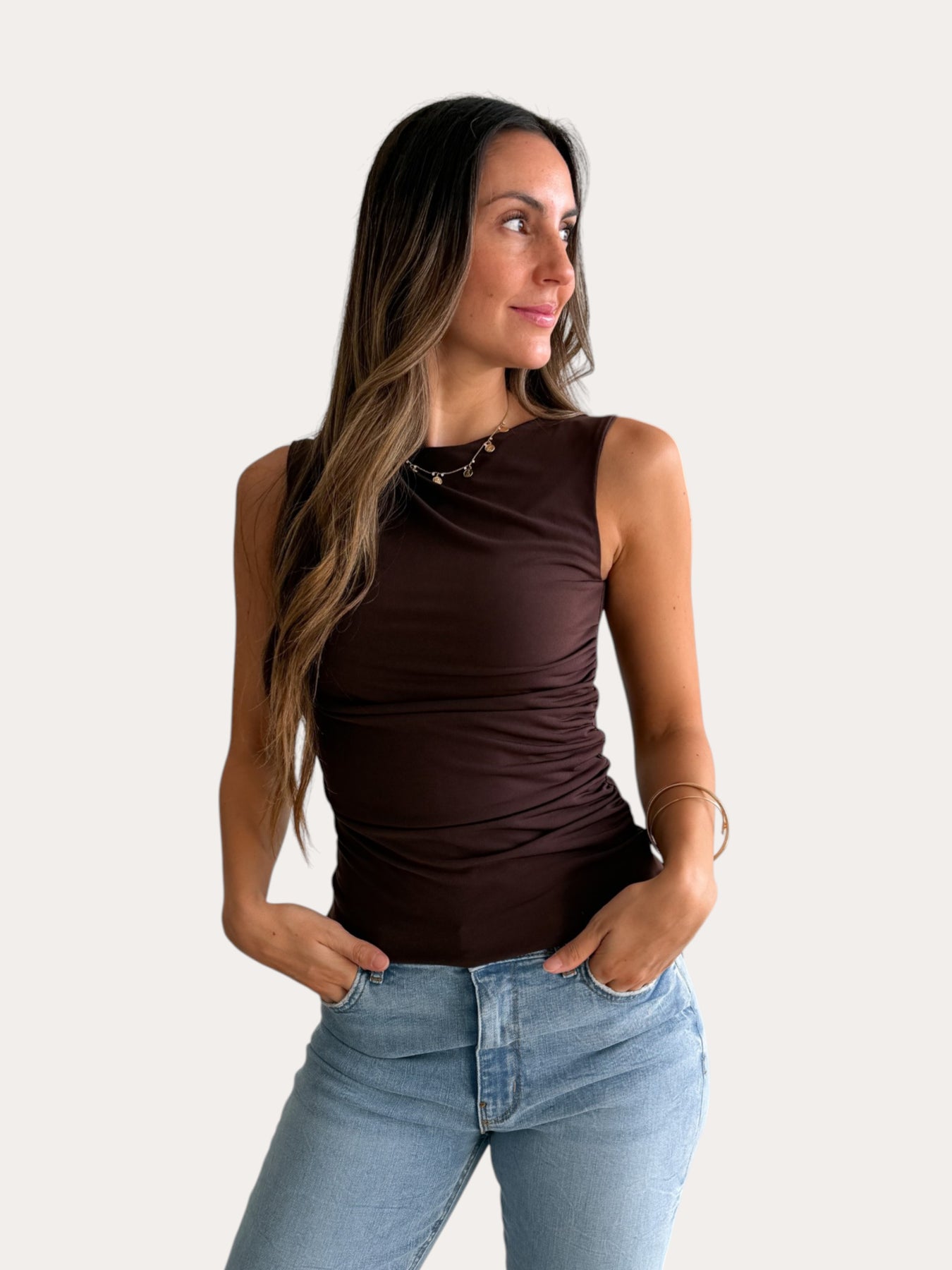 Polera versátil y favorecedora con drapeado en la cintura que estiliza la silueta. Su diseño ajustado y elasticado se adapta cómodamente al cuerpo, aportando un toque elegante sin renunciar a la comodidad. Perfecto para crear looks tanto casuales como más arreglados en cualquier ocasión.